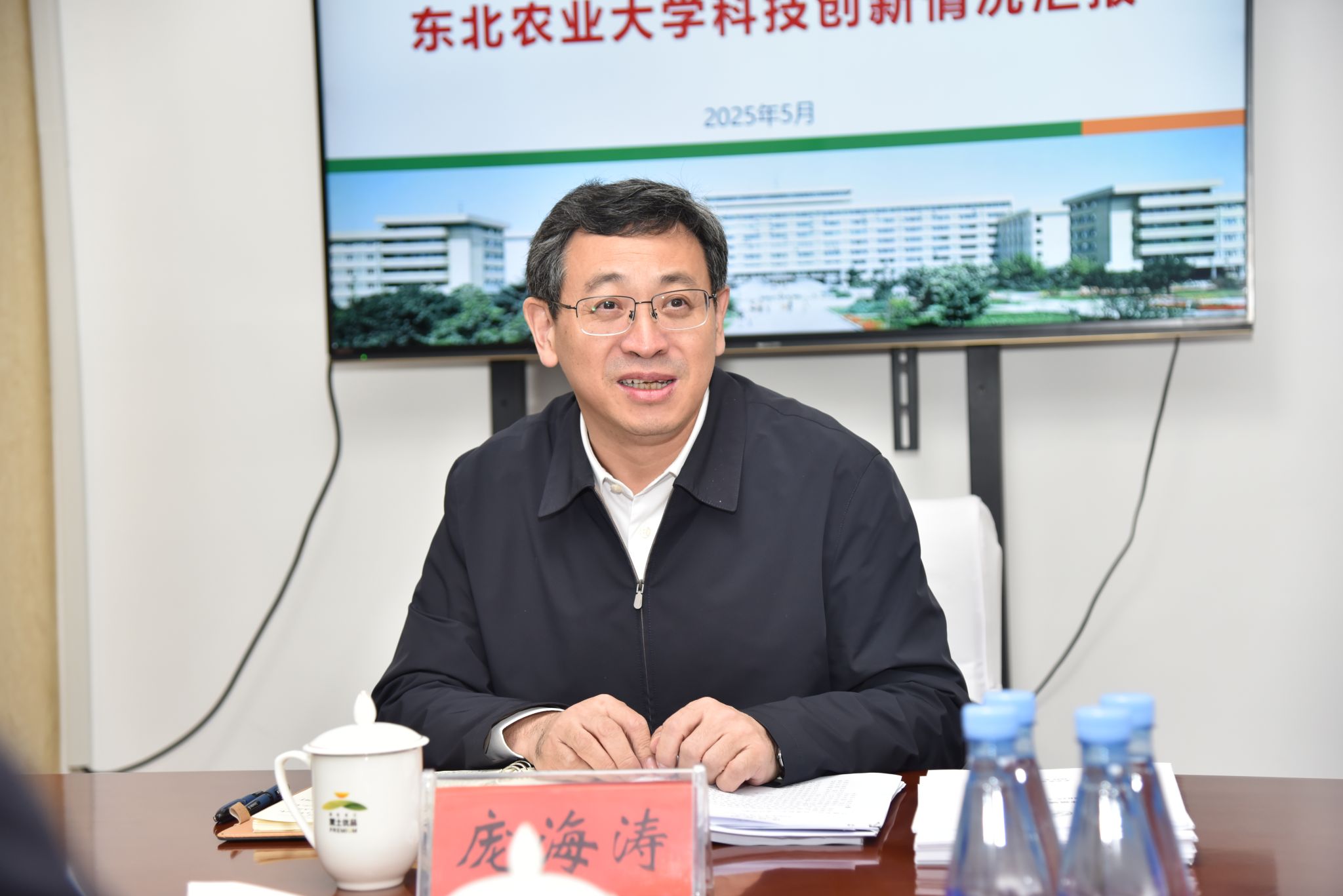 庞海涛在讲话中指出,东北农业大学办学底蕴深厚,在服务国家和龙江“三农”事业中作出了很大贡献,双方合作历史悠久、富有成效,此次来到厅里送智慧、送技术、送服务令他十分感动。目前,龙江正积极围绕农业强省规划、智慧农业、高标准农田建设、高端智能农机研发及大豆产业发展等关键领域推进工作。他希望,双方建立常态化合作机制,统筹科研方向与项目资源,充分发挥自身优势,携手推动农业科技创新与乡村振兴,助力龙江从农业大省向农业强省转变,为我省“三农”工作部署落地和农业强国建设提供有力支撑。