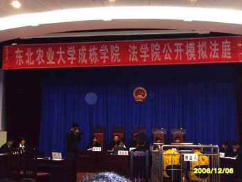 本次模拟审判的案件是哈尔滨市呼兰区一未决真实刑事案件“郭凤江、郭泽满杀人”一案,从材料准备到案件重现的编排完全由成栋学院法学系和法学院学生独立完成。审判现场逼真,受到广泛好评。