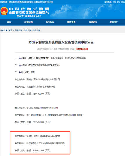 5月28日,中国政府采购网发布了“农业农村部生鲜乳质量安全监管项目中标公告”,黑龙江省绿色食品科学研究院再次成功中标。