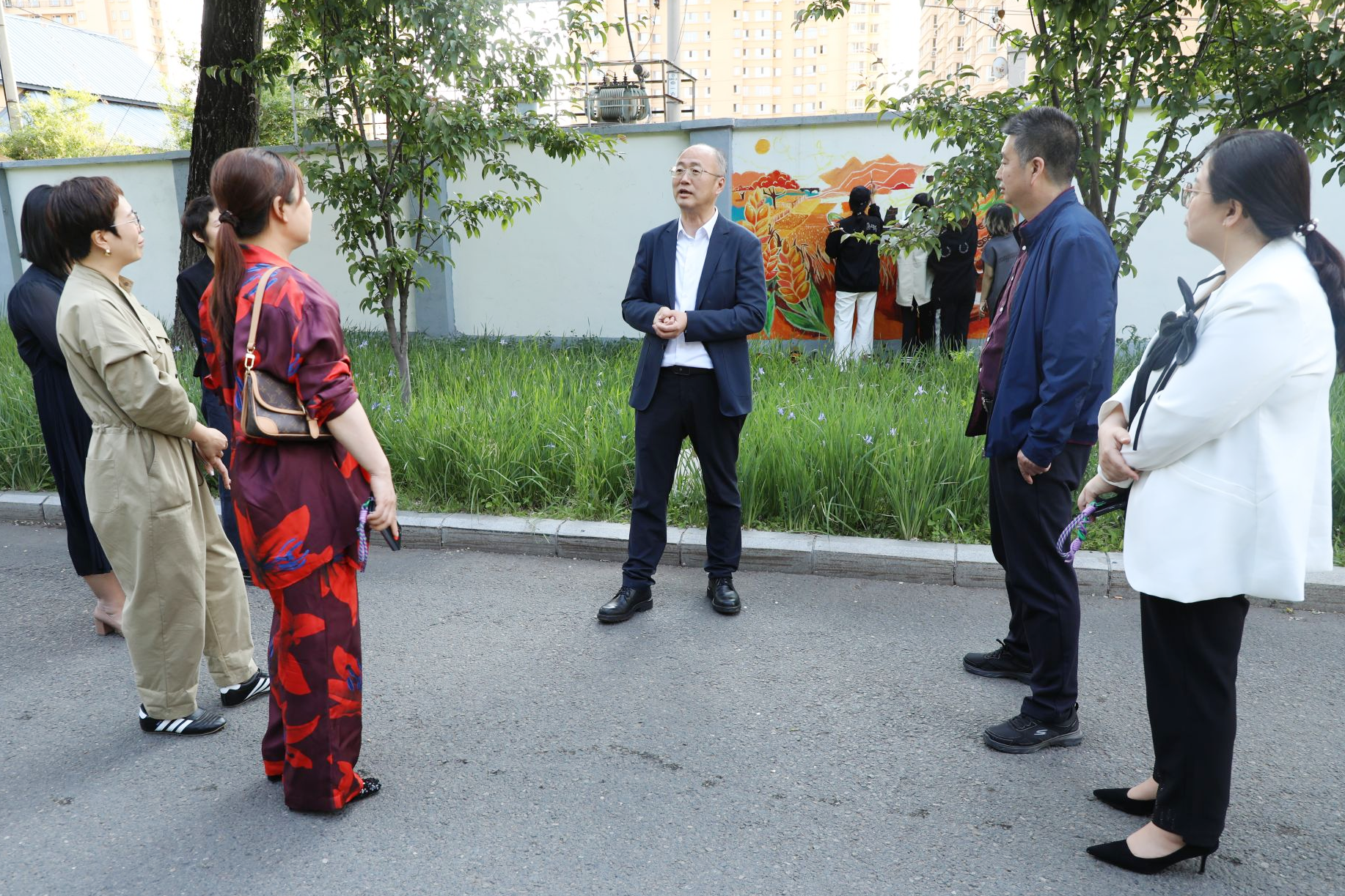 创作期间,校党委书记付强亲临墙绘创作现场,并对现场师生的辛勤付出和创作成果给予了高度评价。他指出,“双一流”高校的建设离不开美好校园环境的营造。此次开展墙绘活动,不仅美化了校园整体环境,更提升了东农校园文化的精神内涵与艺术品位。他鼓励学校师生继续发挥专业优势,创作出更多反映时代精神、彰显校园文化特色的艺术作品,为打造美丽和谐的校园环境、传播东农校园文化贡献力量。
