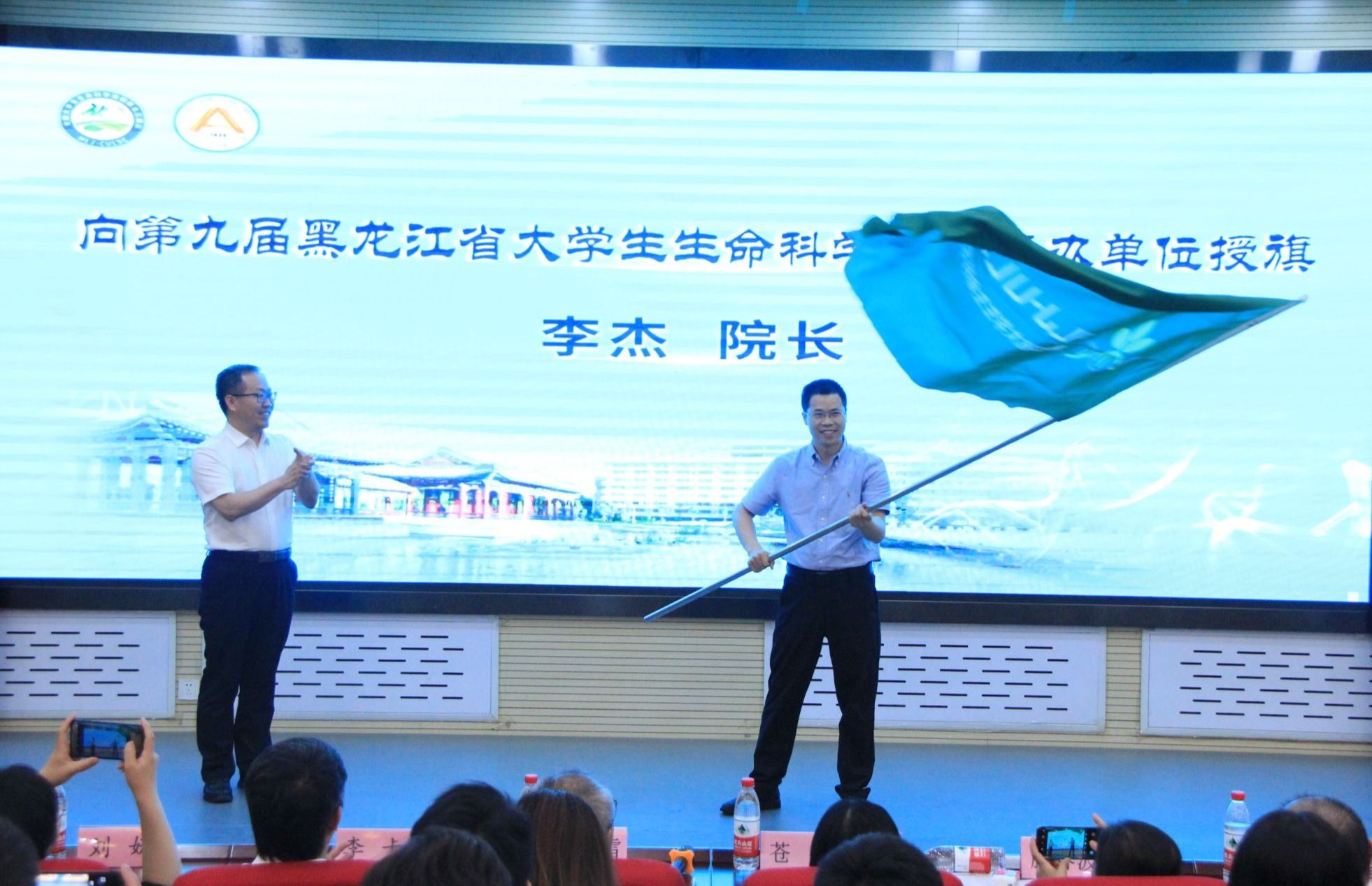 苍晶宣布第九届黑龙江省大学生生命科学竞赛承办单位,李杰向黑龙江八一农垦大学生命科学学院院长晏磊授旗。晏磊在致辞中对我校为本届赛事提供的周密安排和细致服务表示最诚挚敬意和衷心感谢。他表示,本届赛事是一场思想的交锋、学术的盛宴,新一届赛事承办单位一定将这份承载着龙江生命科学教育事业的火炬传递下去。
