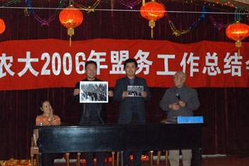 老盟员何万云先生带来了一张珍藏42年的老照片,记录了1964年4月中共中央国务院联合召开全国农业规划会议时,毛泽东、周恩来、朱德、刘少奇和邓小平等国家领导人接见与会人员的场景。照片上有我校四名教师,其中王金陵、何万云、黄祝封均为盟员。会上,何先生深情讲述这张照片的来历,言语中对老一辈盟员业绩的骄傲鼓舞着在场的所有盟员,并将这张照片作为一份厚礼赠送我校宣传统战部和校盟委。