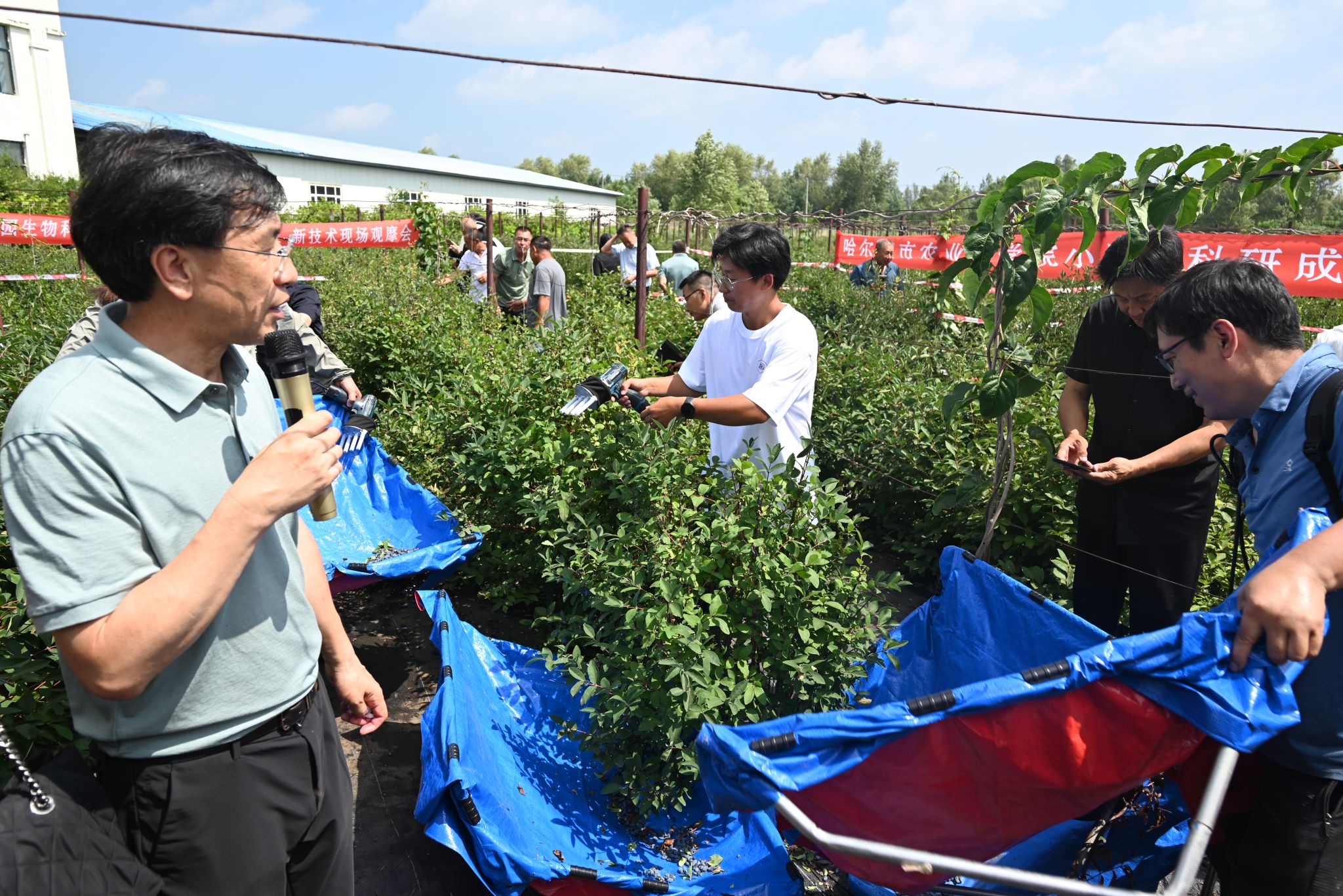 在观摩现场,霍俊伟教授详细介绍了我校育成的系列蓝靛果新品种,并围绕土壤改良、水肥管理、病虫害防治等方面,分享了新品种的栽培要点。为直观展现科研成果对产业的助力。现场演示了学校研发的便携式振动采收机,随着机器启动,蓝靛果果实高效脱落且完好无损,采收效率显著提升,种植户消除了大面积推广带来人工采收成本高的疑问。