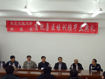 会上,包军副校长向培训班毕业学员简单地介绍了这次培训活动的背景和重要意义,并对毕业学员提出了殷殷希望,希望他们能够立足农村、奉献农村、做新时期的新型农民,将所学应用生产实际,在新农村建设中起到模范带头作用,不辜负地方政府的期望。孟繁久副县长祝贺培训活动的顺利开展,并称本次培训活动是省内第一次新农村援建形式的创新,有着重大的引导意义,期望能够将校县共建活动继续下去。孟副县长还对毕业同学提出了新的要求和期望,并对大家表示了节日的祝贺。农学院院长魏湜、动物科学技术学院院长单安山作为培训活动组织和承办单位分别进行了发言。