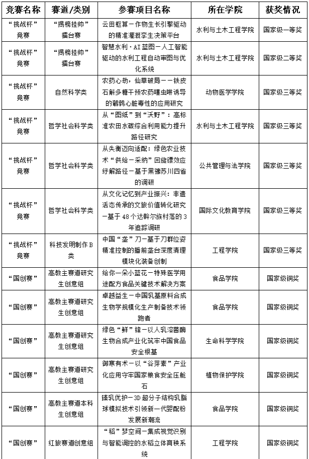 近年来,学校高度重视创新实践育人工作,将其纳入“本硕博”全学段人才培养体系。未来,学校将坚持以立德树人为根本任务,围绕“十五五”学校事业发展和“双一流”建设任务,进一步深化创新实践育人内涵,锚定A类竞赛最高奖项突破目标,聚焦现代农业科技创新与国家战略急需,培养一批高水平创新实践导师,打造一批创新实践精品课程,建立校院两级协同联动的创新实践区,培育一批“硬核科技”师生共创团队,取得一系列标志性成果,推动学校人才培养、创新实践育人提档升级。