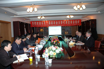 随后, 我校校长助理徐建成、研究生学院院长赵奎军、考务管理中心主任董欣、国际交流处相关人员与乌克兰国家农业大学访问团就两校联合培养研究生一事进行第一次会谈。校长助理徐建成概括介绍了我校的历史、学校办学规模、办学特色、师资结构、学科结构、学科优势、科研流动站以及我校中长期发展建设目标。研究生学院院长赵奎军从研究生学位授权点、招生规模、导师情况、研究生的学制以及研究生学院机构设置等几方面全面介绍了我校研究生教育情况。乌克兰国家农业大学外事副校长卡林斯基•维克多介绍了乌克兰国家农业大学的发展战略及教学、科研方向、科研成果和国际合作。