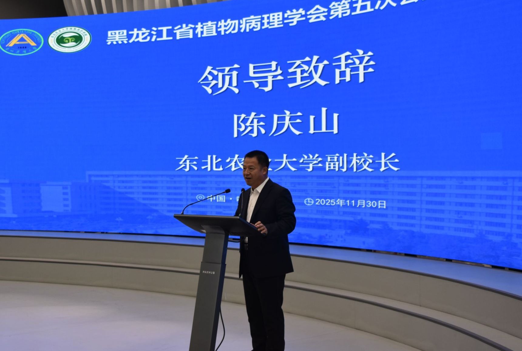 11月30日,黑龙江省植物病理学会第五次会员代表大会暨绿色植保高质量发展学术研讨会在我校召开。本次大会由黑龙江省科协指导,黑龙江省植物病理学会主办,我校植物保护学院承办,吸引了来自政府部门、高校、科研机构以及企业界的众多代表齐聚一堂,共同为黑龙江省绿色植保高质量发展建言献策。黑龙江省科协学会学术部副部长王婧、我校副校长陈庆山、科学技术处(社会科学处)处长王子龙、植物保护学院院长樊东等出席大会。