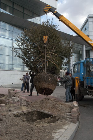 4月4日上午,我校绿化中心又为校园增添一行新绿——在艺术学院(音乐厅)门前移植了8棵树龄约30年的云杉树。作为我校今年绿化工作重点,艺术学院(音乐厅)、农学院、兽医院、新畜牧楼周围的绿化工作目前已经开始启动。