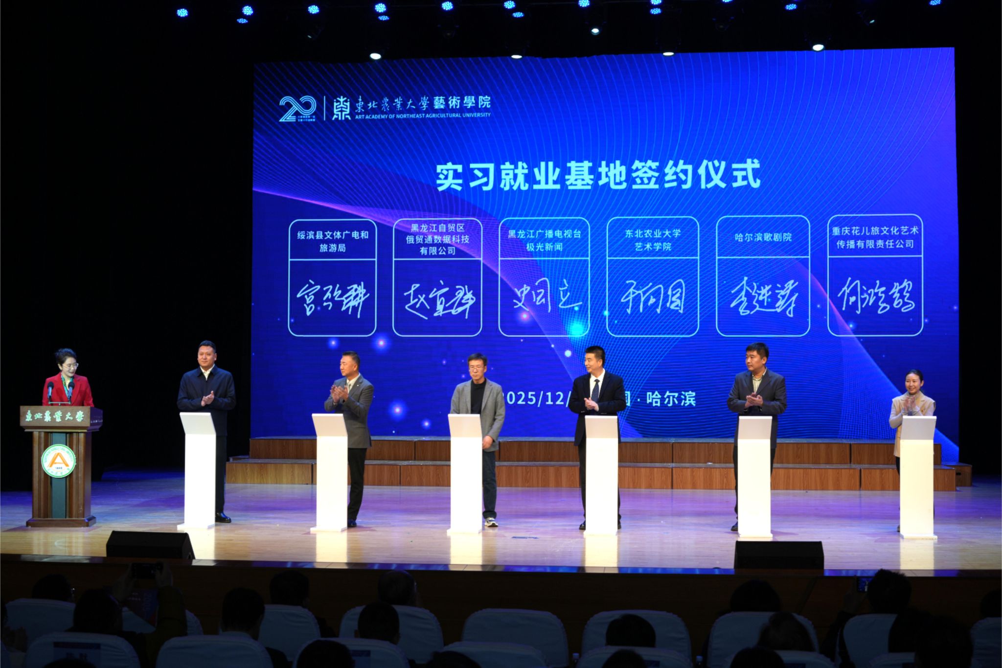 现场还举行了实习就业基地签约仪式,艺术学院与黑龙江广播电视台极光新闻事业部、哈尔滨歌剧院、绥滨县文体广电和旅游局、黑龙江自贸区俄贸通数据科技有限公司、重庆花儿旅文化艺术传播有限责任公司等多家单位携手,为艺术学子搭建更广阔的实习就业平台。