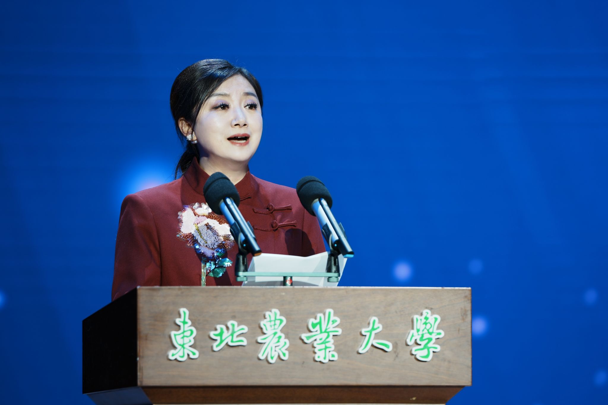 会议在庄严的国歌中拉开帷幕。付强在致辞中回顾了学校近八十载美育积淀与人文传承,肯定了艺术学院二十年来坚守“承农立心 耕美兴邦”初心,走出“农科+艺术”跨界融合特色之路的显著成就。他指出,艺术学院的发展始终与家国共进、与龙江共兴、与东农共荣,为学校高质量发展和黑龙江文化强省、教育强省建设作出了重要贡献。他对艺术学院未来发展提出殷切期望,一是锚定“双一流”建设方向,开创“中国特色、东农风格”的艺术新局。要立足“双一流”建设全局,把艺术学科发展纳入学校高质量发展的总体规划,着力形成具有中国特色、东农风格的艺术体系和教育范式,为世界一流大学“东农梦”筑牢人文根基。二是聚焦高质量育人使命,培育“德艺兼备、艺馨兴农”的艺术新人。要始终把立德树人放在首位,以“农艺融合”为核心深化人才培养模式改革,持续深化与全国兄弟艺术院校、专业艺术团体的交流合作,为学生成长成才搭建更广阔的平台。三是扛起新时代社会担当,打造“赋能振兴、服务人民”的艺术新篇。要主动锚定乡村振兴国家战略,深化产学研融合,持续拓宽校地协同合作,在构建中国自主的艺术知识体系中贡献东农智慧,为助力黑龙江农业强省和文化强省建设作出新的更大贡献。