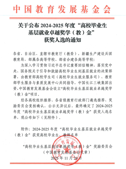 “高校毕业生基层就业卓越奖学金”由教育部高校学生司(高校毕业生就业服务司)、教育部学生服务与素质发展中心共同指导,中国长江三峡集团有限公司出资,中国教育发展基金会特设,旨在贯彻落实党中央、国务院关于引导和鼓励高校毕业生到基层就业的决策部署,奖励赴基层就业并做出突出业绩的普通高校毕业生。