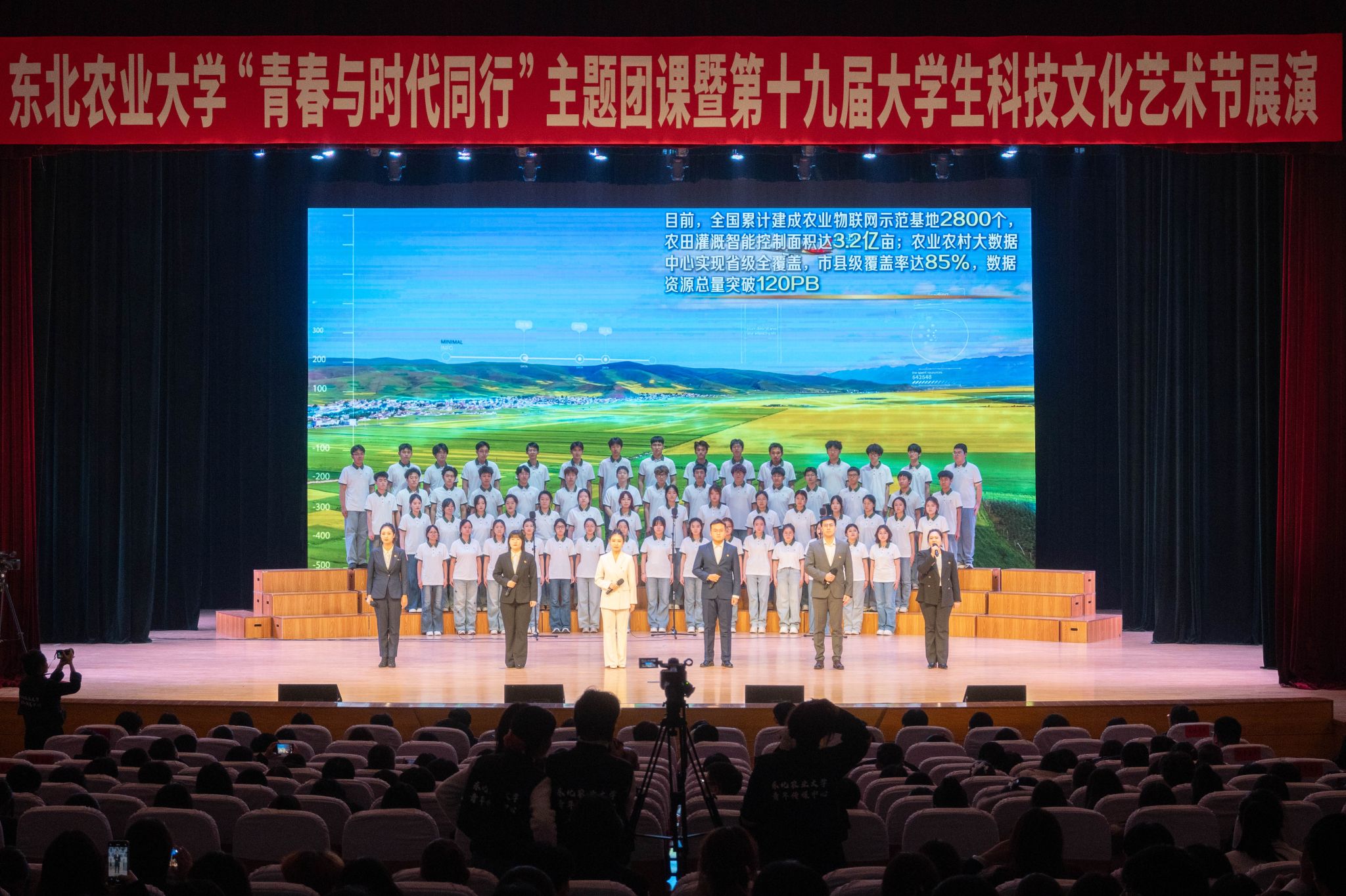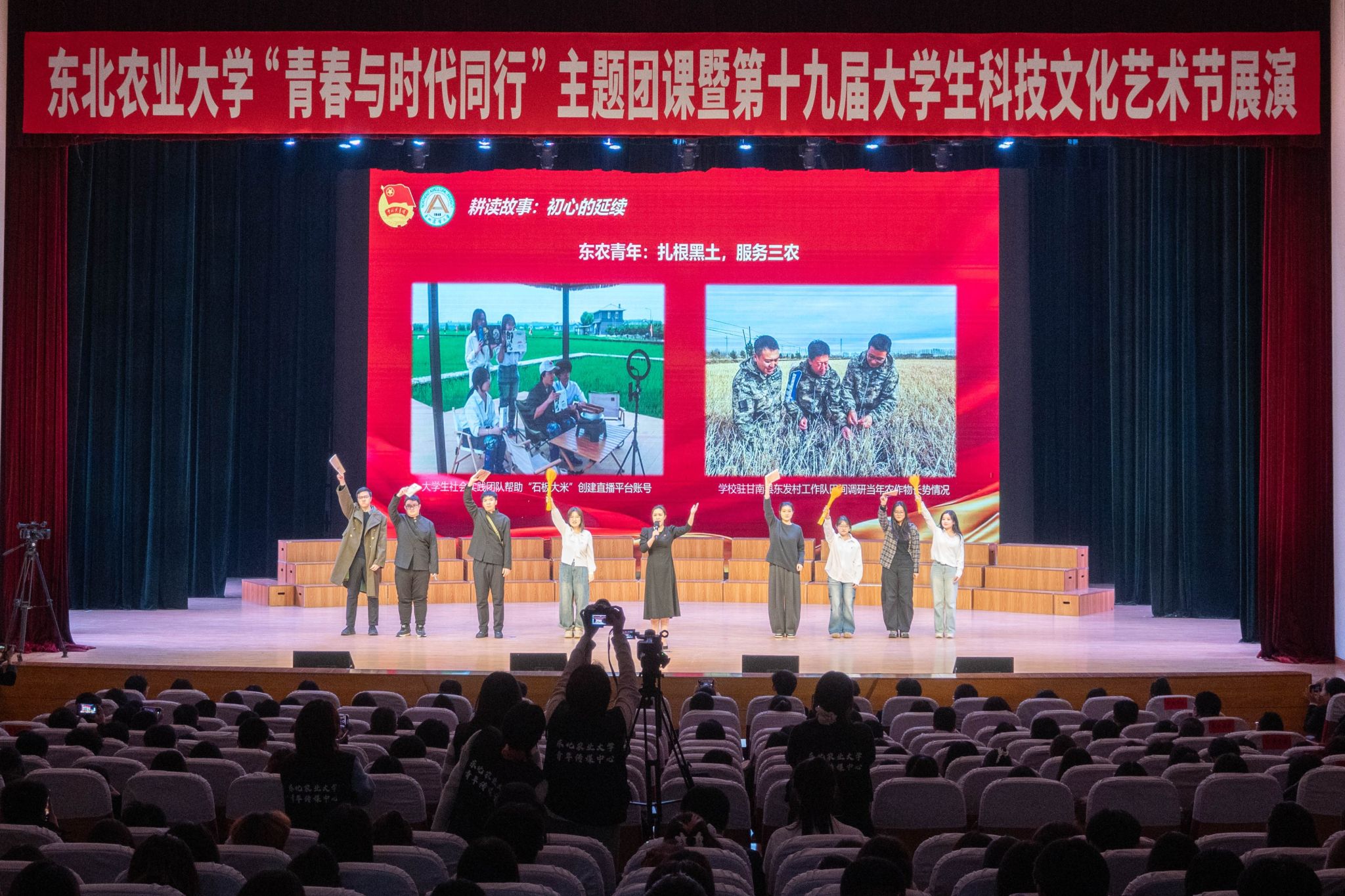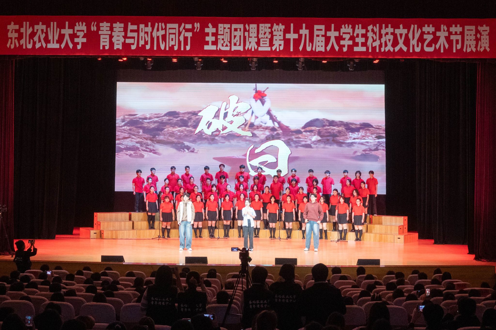 在《有我》的坚定信念中,“平视世界、开创未来的我们”在《跨越山河的奔赴》中,汇聚成奔涌向前的《浪潮》,展现了东农青年传承“薪火”,始终与时代同向、与祖国同行、用青春作答的“新我”担当。最后,全场师生用“我是东农人!我爱东农!我愿意东农好!”的铿锵作答,将整场活动的氛围推向高潮。