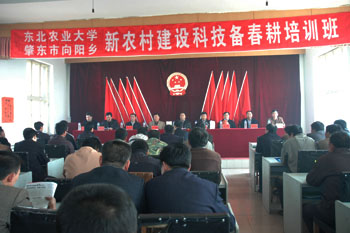 我校一行得到了肇东市委、市政府的热烈欢迎,肇东市市委副书记孙景山、副市长李霈霜等亲切迎接我校专家、教授。在“新农村建设科技备春耕培训班”开幕式上,李庆章校长代表我校党委、行政对培训班的顺利开班表示祝贺。他回顾了我校一年来在帮扶肇东市向阳乡中心村新农村建设中采取的各项措施。他强调指出,新农村建设物质方面的帮助只能解决一时之需,社会主义新农村建设必须依靠科技和教育的大力支撑。李校长还代表学校向向阳乡中心小学捐赠了乒乓球台及篮球、足球、排球等体育用品,并向向阳乡农民捐赠了蛋鸡、奶牛等专业养殖技术丛书百余册。