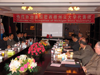 李庆章校长代表我校对来宾表示欢迎,并介绍了我校概况。阿姆斯壮先生表示密西根州立大学一直非常重视与我校的合作,并希望合作能够在科研和教学等领域进一步发展。
