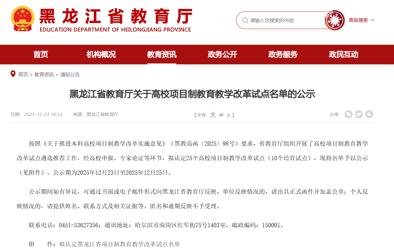 近日,黑龙江省教育厅先后公布了2025年度本科专业与区域发展匹配度分析与提升试点高校以及项目制教育教学改革试点名单,我校在两个重要改革领域均成功入选,充分彰显了学校在深化专业建设改革、服务区域发展战略方面的扎实基础和引领能力。