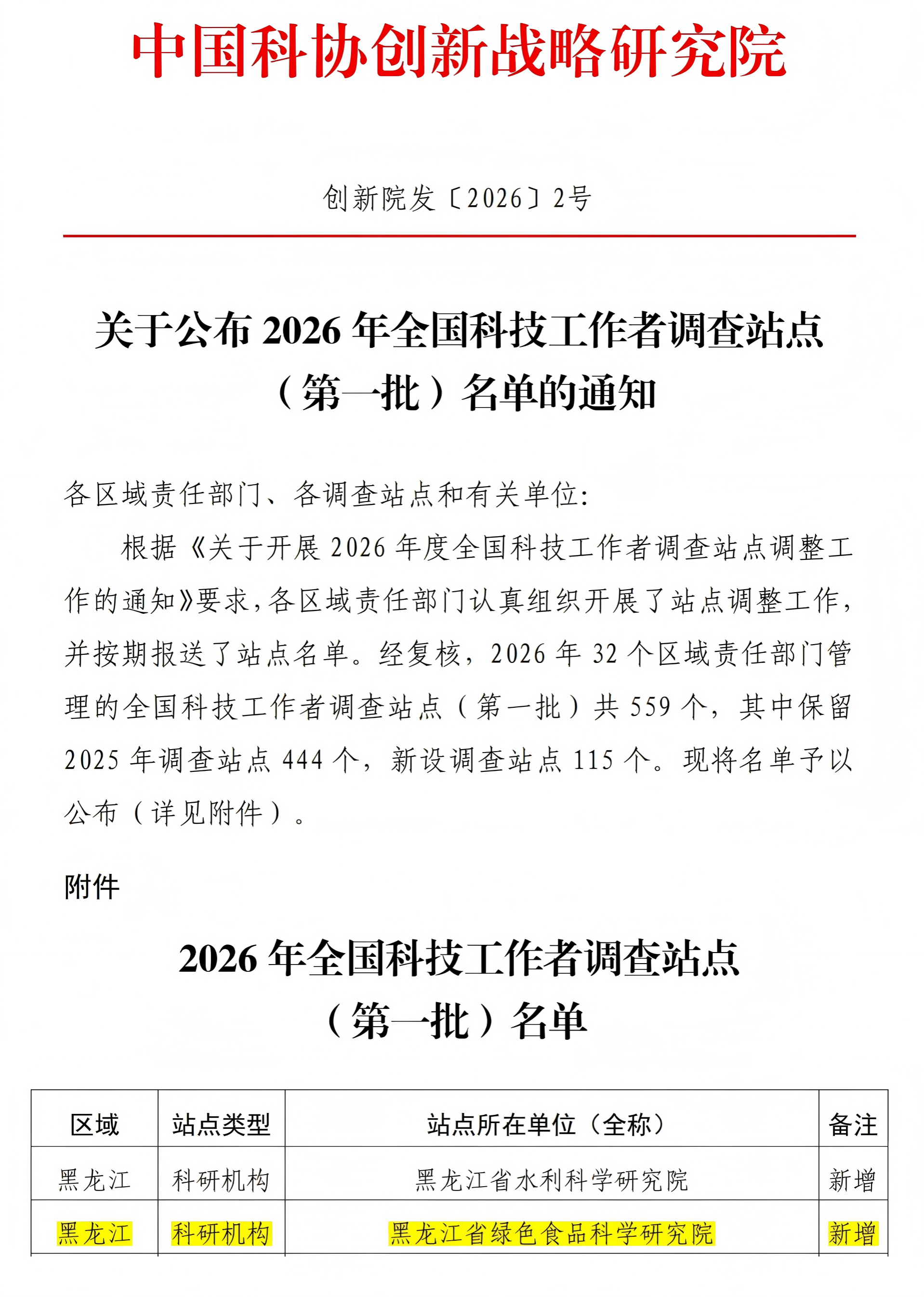 近日,中国科协创新战略研究院正式公布了2026年全国科技工作者调查站点(第一批)名单。凭借在食品科研领域的深厚积淀与扎实的工作基础,我校绿研院成功入选,成为本批次黑龙江省两家新增调查站点之一。