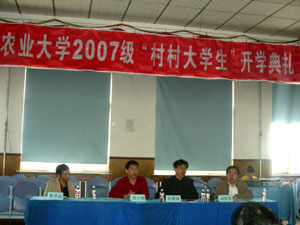 应用技术学院院长梁云福代表学院全体师生致欢迎词。他鼓励2007级新生继承和发扬“村村大学生计划(培养)”学生的优良传统,刻苦学习、全面提高,争取以优异的成绩毕业,以过硬的本领回报家乡父老。2006级“村村大学生”代表崔景林、2007级新生代表赵莹分别发言。