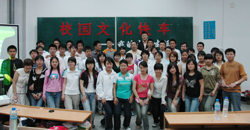 晚上6时,“校园文化快车”在悠扬的音乐中启程。主持人简短的开场后,通过幻灯片对李校长的经历进行了简要介绍。被李校长儒雅博学的气质深深吸引的同学们,怀着激动与迫切的心情、以热烈的掌声请出了李庆章校长。