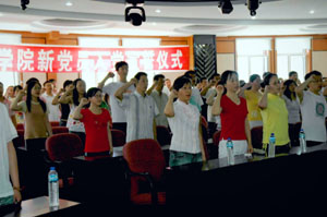 毕业班党员代表王国荣同学在会上发言,她感谢党的培养,感谢学校和学院的教育,决心牢记社会主义荣辱观,牢记誓言,在以后的征途中,时刻发挥党员模范带头作用,切实履行党员义务,永葆共产党员的先进性,做一名新时期优秀的共产党员。付桂珍书记向刚刚宣誓的新党员表示衷心的祝贺,号召新党员要向老党员学习,向优秀的共产党员学习,不断加强党性锻炼,树立高尚的道德情操,践行党的先进性,维护党的光辉形象。此外,她还向教工党员和毕业班党员提出了要求:希望教工党员要在教工要起到模范带头作用,要做到德高业精,不断为党和人民培养出优秀的人才;希望毕业班党员要恪守入党誓词,不仅要在组织上入党,还要做到思想上入党,努力提高为人民服务的本领;希望毕业班党员在文明离校工作中起到模范带头作用,在以后的工作岗位上更加努力,学以致用,成为我国社会主义建设事业的优秀建设者和接班人。