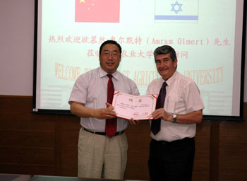 6月17日下午,以色列驻华大使馆前农业科学部公使衔参赞欧慕然•奥尔默特(Amram Olmert)先生,在省社科院哈尔滨犹太研究中心副主任李述笑研究员的陪同下莅校访问。校党委书记刘世常,校长李庆章,副校长包军、秦智伟,校长助理徐建成会见了来访客人,科技处、食品学院、国际交流处及学校办公室相关领导和有关人员参加会见。访问期间,欧慕然先生被我校聘请为客座教授,李庆章校长代表学校向其颁发了聘书。