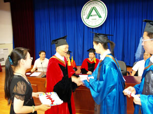毕业典礼在庄严的国歌声中拉开序幕。副院长刘建禹宣读了获得毕业证书、学位证书学生名单;副院长苏中滨宣读了获得“黑龙江省优秀毕业生”荣誉称号的学生名单。与会领导和教师向毕业生代表颁发毕业证书并授予学位,同时向获得“黑龙江省优秀毕业生”称号的学生代表颁发荣誉证书。