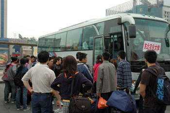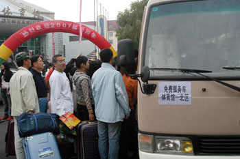在新生报到处,我们还可以看见贴着“免费服务车”字样的中巴车,这是学校考虑一些学生的寝室与报到处距离较远,为方便学生报到和办理住宿,专门调来了服务车,这大大方便了前来报到的新生和家长。同时学校还在哈尔滨车站设立了新生接站车,为远道来的同学提供方便。