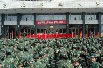 在校纪检委书记李潮江主持下,大会首先举行了庄严的升国旗仪式。校长李庆章代表学校党政领导和全体师生向5880名新同学们表示了衷心的祝贺和热烈的欢迎,对执行此次军训任务的全体教官表示衷心的感谢和崇高敬意。在简要回顾了东农近60年的骄人业绩后,李校长对大一新生就如何成为“德、智、体”全面发展的合格人才提出三点建议:第一,要“立德”以“树人”。提出德才兼备才是完整意义上的人才。建议学工处把《知荣明耻,做一名合格大学生》这封倡议书发到每名新生的手中,使大家通过自我对照知荣名耻,不断提高自身的道德水平,努力成为一名有道德的人。第二,要“育智”以“蓄才”。提倡广大新生运用科学的学习方法,结合社会实践来打牢知识根基,成为真正有用之材。第三,要“健体”以“成功”。 全面发展的合格人才需具备强健的体魄和健康的心理。他鼓励大家通过体育锻炼,强身壮体、磨练意志;通过心态调整,优化心理素质、完善人格。