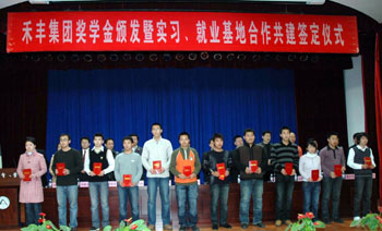 11月26日晚,禾丰牧业集团奖学金颁发暨实习、就业基地合作共建签字仪式在我校图书馆隆重举行。禾丰集团总裁王凤久,我校党委副书记胡国良,校团委书记李友善,招生与就业指导处处长董明,动物科学技术学院党总支书记高越山、院长单安山,动物医学学院党总支书记魏萍、院长郑世民等应邀出席了本次颁奖大会。