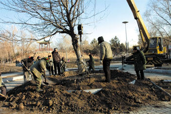 据了解,移栽此株山梨树是我校总务部校园绿化中心今秋明春开展校园植物配植工作的一尊“戏眼”,该树取自帽儿山林场,树龄约40余年,是我校迁址马家花园以来移栽的最大树木。工作人员已采用多种措施以确保其存活。
