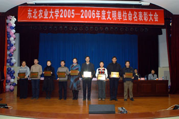 12月26日,我校召开2005—2006年度文明单位命名表彰大会。党委书记刘世常,校长李庆章,党委副书记胡国良,副校长秦智伟、包军、刘荣、冯晓、郑秋鹛,纪委书记李潮江等出席大会。胡国良副书记主持会议。