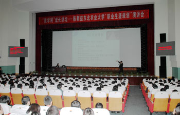 讲座包括PPT讲座和现场回答提问两个环节。陈朝益先生站着完成了两个多小时的讲座,他从职业生涯规划的重要思路和行动、如何进入理想企业、进入公司前90天、2008年科技市场大趋势四个方面讲起,通过他丰富的人生经历、大量的生动事例以及平和、幽默的表达方式,为东农学子上了一堂生动的职业生涯规划指导课。