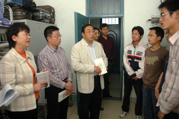 14日下午,校党委书记徐梅、校长李庆章、党委副书记胡国良前往学生宿舍,看望了家乡受灾的学生,为每名家中遭受损失的学生送去500元慰问金,并嘱托他们不要有后顾之忧,安心读书,有困难及时反映,学校会全力帮助解决。(图为徐梅、李庆章、胡国良到寝室看望家乡受灾的学生)