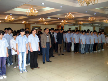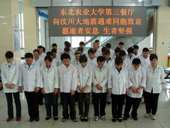 5月19日电 14时28分起,全国人民为四川汶川大地震遇难者默哀3分钟。各地汽车、火车、舰船笛声长鸣,防空警报在各城市上空鸣响。东北农业大学饮食服务中心全体员工向四川汶川大地震遇难者表示深切哀悼。