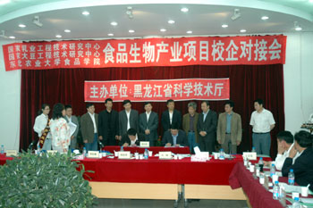 黑龙江省飞鹤乳业有限公司、大庆乳品厂有限责任公司、哈尔滨义利实业有限公司、伊春好而思绿色山特产品有限责任公司分别与国家乳业工程技术研究中心、东北农业大学食品学院进行了现场签约仪式,并签订了“风干肠直投式发酵剂”、“婴幼儿配方奶保质期内的生物特性变化”、“功能性婴幼儿配方奶粉”、“食用菌食品的研制开发”等合作开发项目,直接确定合作研发经费64万元,现场确定意向性合作研发项目多项。