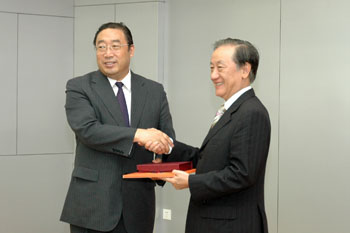 我校李庆章校长与台湾新党主席郁慕明互赠礼品