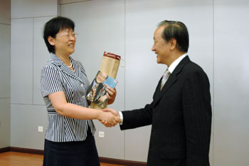 我校徐梅书记与台湾新党主席郁慕明互赠礼品