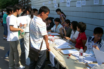 为方便新生报到,研究生部简化报到程序,在体育馆外现场办公,为研究生新生报到创造便利条件,及时处理好各种报到事宜,帮助新同学解决遇到的困难和问题。在校财务处、舍务中心、保卫处等部门的密切配合下,迎新工作紧张、有序地进行, 确保了08级研究生的顺利报到。