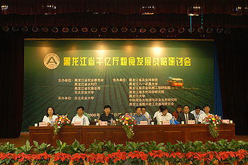 黑龙江千亿斤粮食发展战略研讨会正式开始,校党委书记徐梅、副校长郑秋鹛分别主持了上午和下午的研讨会。上午,省农委副主任白雪华、省水利厅总工程师赵伟民、省农垦总局发改委主任王峰和我校校长李庆章做为主办方代表,分别向大会作了名为《千亿斤粮食生产能力战略工程目标与任务》、《水利建设与千亿斤粮食工程》、《黑龙江垦区300亿斤商品粮战略基地建设发展规划》和《黑龙江省千亿斤粮食生产的可能障碍因素与对策》的主题报告;下午,省农科院、黑龙江八一农垦大学、省农业机械工程研究院、省水利科学研究院、黑龙江大学、中科院东北地理与农业生态研究所、省振兴老工业基地研究会7家协办单位代表及依安县委书记白祥和分别向大会作精彩报告。