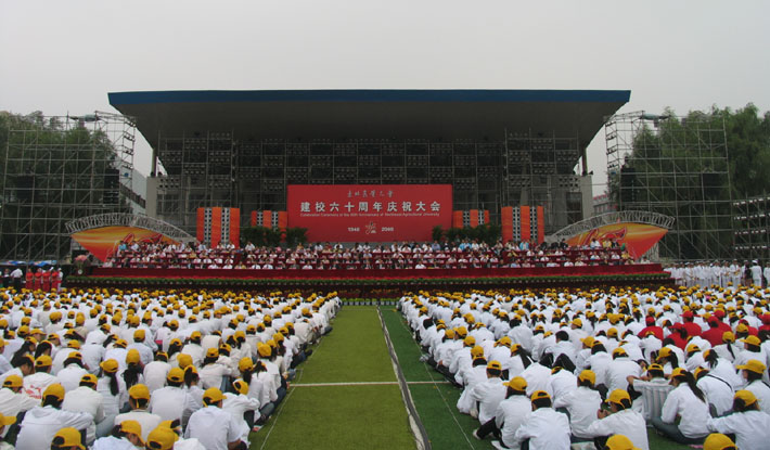 入夜,华灯把校园装扮得更加壮美,校友们、来宾们成群结队观赏校园夜色,流连忘返。晚19时30分,全体师生、校友、嘉宾欢聚学校体育场共同欣赏了《希望的田野》我校庆祝建校六十周年文艺晚会。