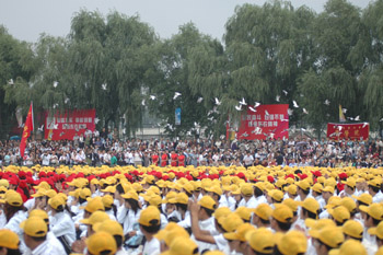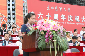 上午9时许,校党委书记徐梅站在鲜花簇拥的主席台前,向全校师生介绍与会领导、嘉宾和校友,并向各位的光临表示欢迎。徐梅书记宣布东北农业大学建校60周年庆祝大会隆重开幕。霎时,2000只和平鸽飞向天空,礼炮齐鸣。国旗护卫队迈着整齐的步伐入场,国歌奏响,国旗升起。