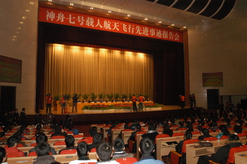由黑龙江省委、省政府联合主办的神舟七号载人航天飞行先进事迹报告会,于21日上午在哈尔滨华旗饭店环球剧场召开。报告团成员结合自己的经历和感受,向现场观众深情讲述了广大航天科技工作者和部队官兵圆满完成神舟七号载人航天飞行任务的感人事迹。报告会由省委常委、宣传部部长衣俊卿主持。包括我校100名师生在内的1600余名社会各界人士参加此次报告会。