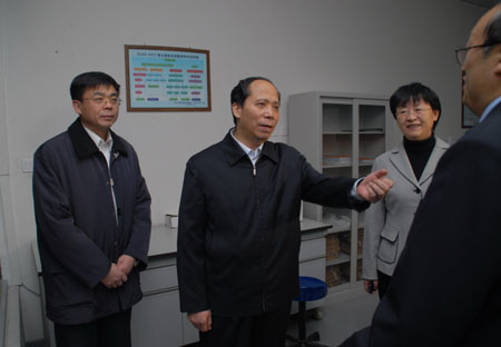 吉炳轩书记首先来到我校“乳品科学教育部重点实验室”,视察了乳品发酵研究室、生物技术研究室、乳酸菌菌种库保藏中心、乳品工程中试中心等,重点实验室主任霍贵成教授介绍了实验室的建设和科研情况,汇报了我校将在乳品安全研究和“全省千万吨奶工程”中实施服务的工作思路。吉炳轩书记说,你们的条件不错,要加快研究步伐,加强科技创新,多出成果。吉炳轩书记在品尝了实验室研究的乳制新产品时说,你们的产品不错,应当加大成果转化力度,尽快实施产业化。徐梅书记和李庆章校长向吉炳轩书记介绍我校乳品研发平台建设情况。吉炳轩书记非常高兴,他鼓励说,要加大建设力度,打造一流的研究平台,为我省的建设作贡献。离开乳品重点实验室,吉炳轩书记又来到我校“教育部大豆生物学重点实验室”,视察了大豆组织培养室、大豆分子生物学研究室、大豆非生物胁迫实验室、低温实验室、步入式智能人工气候培养仓等,吉炳轩书记兴致勃勃,他说,大豆研究要在品种上有突破,要从黑龙江的实际出发,研究早熟、高产、高油、高蛋白品种,其中高油是第一位的,因为中国是吃油大国,目前大量食用油是靠进口。他希望东农的研究人员在大豆、谷子、小麦等农作物的育种上下功夫,瞄准一个目标,长期潜心研究,反复地试验、培育、杂交,历经几代,抓出成效。