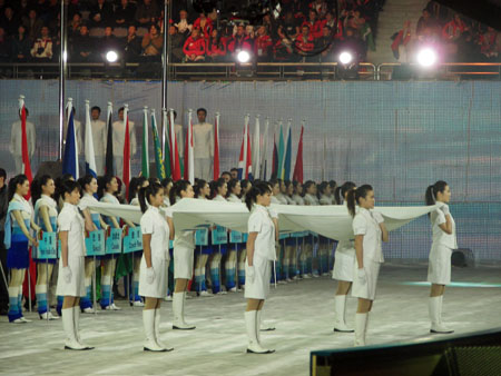 在这期间,也有其他高校要求担任此项任务,大会对护旗任务进行了分工,由三所学校担任护旗任务。后来,经过多次检查,导演最后确定,国旗、大冬会会旗、大学生体育联合会会旗的护旗、升旗任务全部交由东北农业大学国旗护卫队完成。同时,再增加36名刀旗手任务,共计72人。由于人员的增加任务加重,学校又从军事协会选调一部分同学充实到刀旗方阵中。