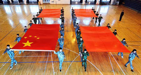 基本队形和动作排练完成后,同学们还要伴随音乐进行练习,来增加乐感和现场适应力。升旗手刘德伟、刘子川为了在国歌最后一个音符结束,把国旗精确升至旗杆顶端,他们把乐曲分成段来拉动旗绳。最后,达到将眼睛蒙上,凭听力、乐感也能一秒不差的将国旗升至杆端。升旗台上的同学为练习眼神,眼睛控制在20秒眨一次,最后达到40秒眨一次,训练时眼睛难受得直流眼泪。大体联会旗护旗手慕晓磊同学不慎脚扭伤,脚踝肿的老高,但最后还是忍着剧痛坚持上场,参加开幕式护旗,圆满完成了任务。