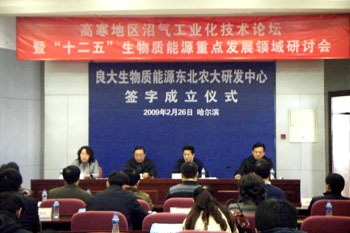 开幕式后,举行了“良大生物质能源东北农大研发中心”揭牌仪式。为了加速高寒地区沼气生产工业化技术推广与应用,推进生物质能源的产业化进程,哈尔滨良大实业与我校生物质能源科研团队合作成立“良大生物质能源东北农大研发中心”,李庆章校长与良大实业魏世锋经理举行签字仪式,由科技部农村技术开发中心余健主任和黑龙江省科技厅潘忠副厅长为“良大生物质能源东北农大研发中心”揭牌,该中心的成立标志着我校在产学研结合上又迈出了新的一步。