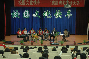3月5日晚5点30分,由校团委、校学生会主办的《校园文化快车》——“志愿者归来话大冬”访谈会,在新图书馆一楼报告厅举行。访谈会的嘉宾分别为高放、何小川、宋凯玞、魏天赋、时延鑫、陈春蕾, 6位参加大冬会志愿服务工作人员及志愿者与全场400余名师生对话大冬会期间志愿服务的经历与感受。学生工作处处长解宗军、校团委书记李友善、校团委副书记王少逸、于兴业、高汉峰出席了本次访谈会。访谈会由校学生会宣传部部长刘晓磊主持。