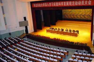 省委深入学习实践科学发展观活动指导检查组组长孟东昕讲话。他指出,徐梅书记对东北农业大学开展深入学习实践科学发展观活动作了动员和部署,进一步明确了开展学习实践活动的重大意义、指导思想、原则要求和方法步骤,并对各级党组织开展好学习实践活动提出了明确要求,既有宏观指导性,充分体现了中央和省委的精神,又有切实的可操作性,符合学校的实际。他代表省委指导检查组对此次活动提出三点意见:一要充分认识搞好学习实践活动的重大意义,切实增强责任感和使命感;二要准确把握学习实践活动的指导思想、目标要求和主要原则,确保学习实践活动健康有序开展;三要坚持高标准、高质量,确保学习实践活动取得实效。
