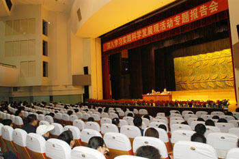 4月22日下午,我校在音乐厅召开深入学习实践科学发展观专题报告会。省委党校副校长、省委深入学习实践科学发展观活动解放思想主题教育宣讲团成员杜国钧教授应邀作了题目为《深入贯彻落实科学发展观,实现经济社会又好又快发展》的辅导报告。