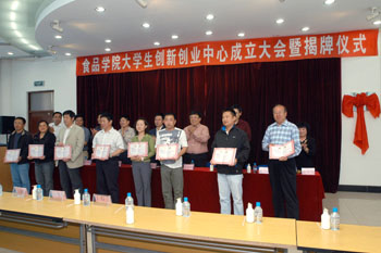 会上,与会领导、嘉宾为创新创业中心指导教师及企业代表颁发了聘书。胡国良副书记和食品学院原党总支书记宋丽华共同为大学生创新创业中心揭牌。会后,与会人员参观了食品学院大学生创新创业中心的学生食品烘焙中心和酸奶生产车间。