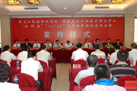 7月17日上午,国家乳业技术研究中心、黑龙江民族职业学院与来自省内外的15家乳品企业代表齐聚哈尔滨,共同签署“校研企”“1+1+1”产学结合人才培养模式合作办学协议,并签署“人才订单”。黑龙江省政府副省长程幼东、省政协副主席刘海生、省教育厅厅长张永洲、省民委主任沃领生、省民委副主任李顺宝,我校校长李庆章、副校长胡宝忠,黑龙江民族职业学院党委书记徐向国、院长徐建成以及三元乳业公司、飞鹤乳业、完达山乳业等15家乳品企业出席了签约仪式。